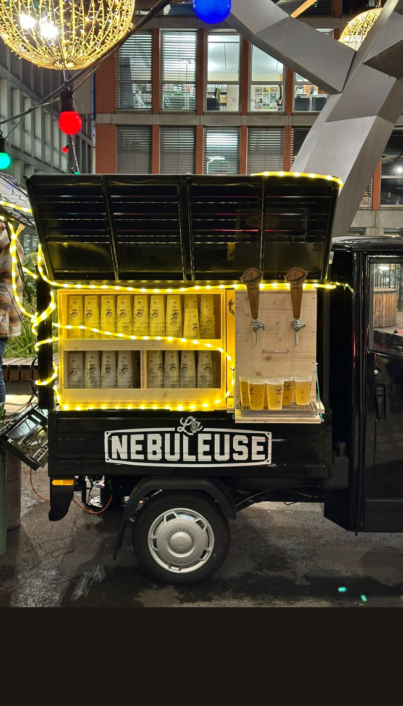 Mit unserem mobilen Zapfhahn und unserem zur Bar umgebauten Oldtimer-Piaggio können Sie Ihren Gästen frisch gezapftes Craft-Bier von La Nébuleuse vom Fass anbieten.