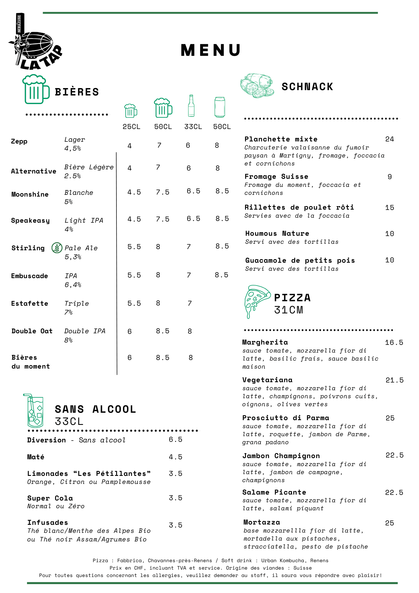 All prices shown are in Swiss francs (CHF): 25cL / 33cL / 50cL